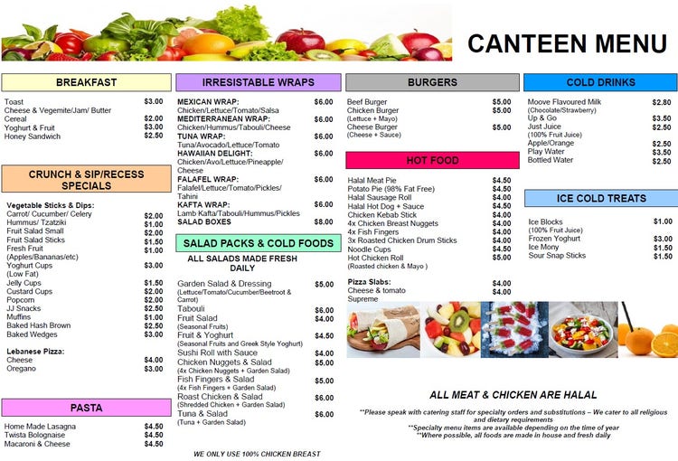 Belmore North Public School canteen offers a diverse range of healthy food options that reflect the rich cultural diversity of our community. Students can enjoy nutritious meals and snacks inspired by various cuisines, ensuring there is something delicious and wholesome for everyone. From fresh salads and wholegrain sandwiches to flavorful dishes influenced by Asian, Mediterranean, and Middle Eastern flavours, the canteen promotes balanced eating habits while celebrating multicultural tastes. This variety not only supports students’ health and wellbeing but also encourages them to explore and appreciate different culinary traditions.